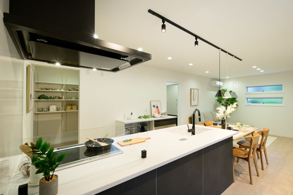 黒一色の外壁に木目調のドアが映える、窓の配置まで計算されたスタイリッシュな外観が象徴的です。室内は、対面式のオープンキッチンを中心とした開放的なレイアウトを採用。LDKからフラットに繋がるプライベートテラスや、キッチン横に設けた大容量のパントリーなど、家事動線とくつろぎの質にこだわった機能美あふれる空間です。