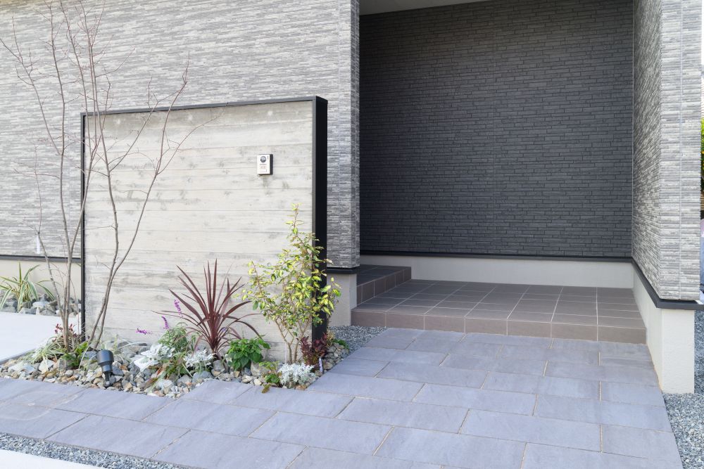 コンクリートの質感が際立つ門柱が、洗練された玄関を演出。