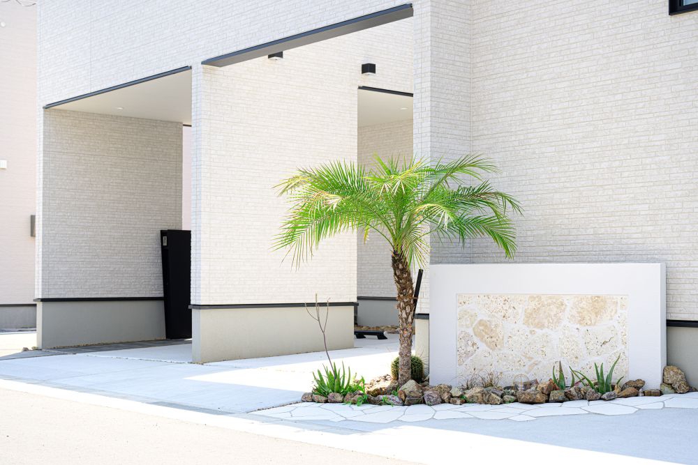 リビングから直接愛車の様子を眺めることができるビルトインガレージです。室内は、キッチンからダイニング、リビングへと一直線に繋がる開放的なレイアウトを採用。ガレージからの荷物の搬入もスムーズな動線設計や、ヤシの木が映えるリゾートライクな外構デザインなど、平屋の利便性とラグジュアリーな日常を両立させました。