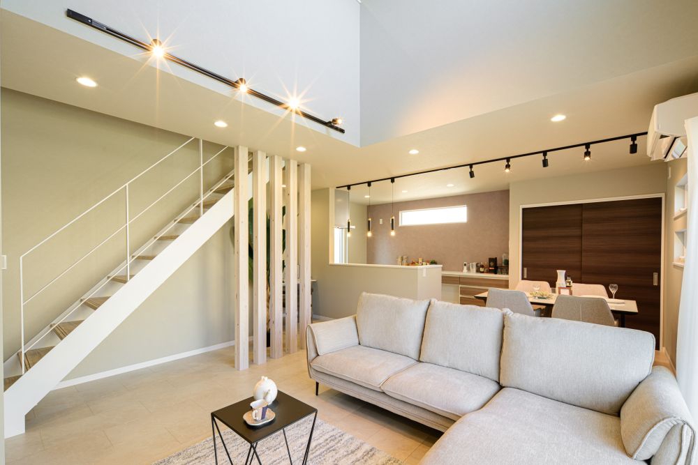 リビング上部に広がる大きな吹き抜けが心地よい開放感を創出します。シーリングファンが回る高天井からは柔らかな光が差し込み、石目調のアクセントウォールが洗練された印象を際立たせます。キッチン横には便利なデスクコーナーを設け、機能的な家事動線とデザイン性を両立させた、都市型モダンの住宅です。