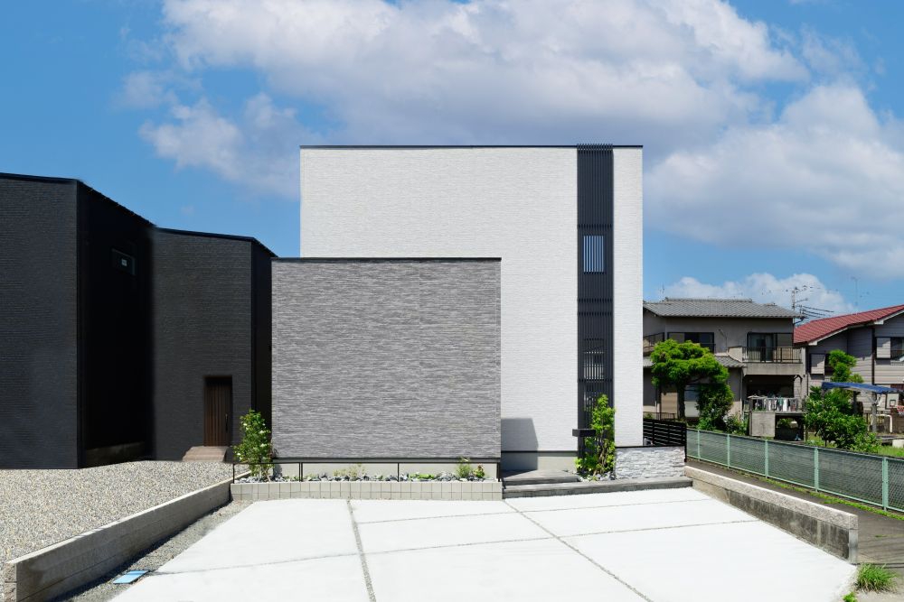 白とグレーのスクエアなラインが美しい、モダンな外観デザイン。