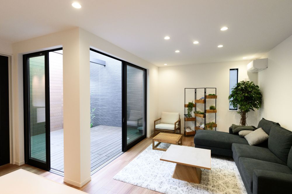 大窓からテラスへ視線が抜け、室内外が一体となる開放的な空間。