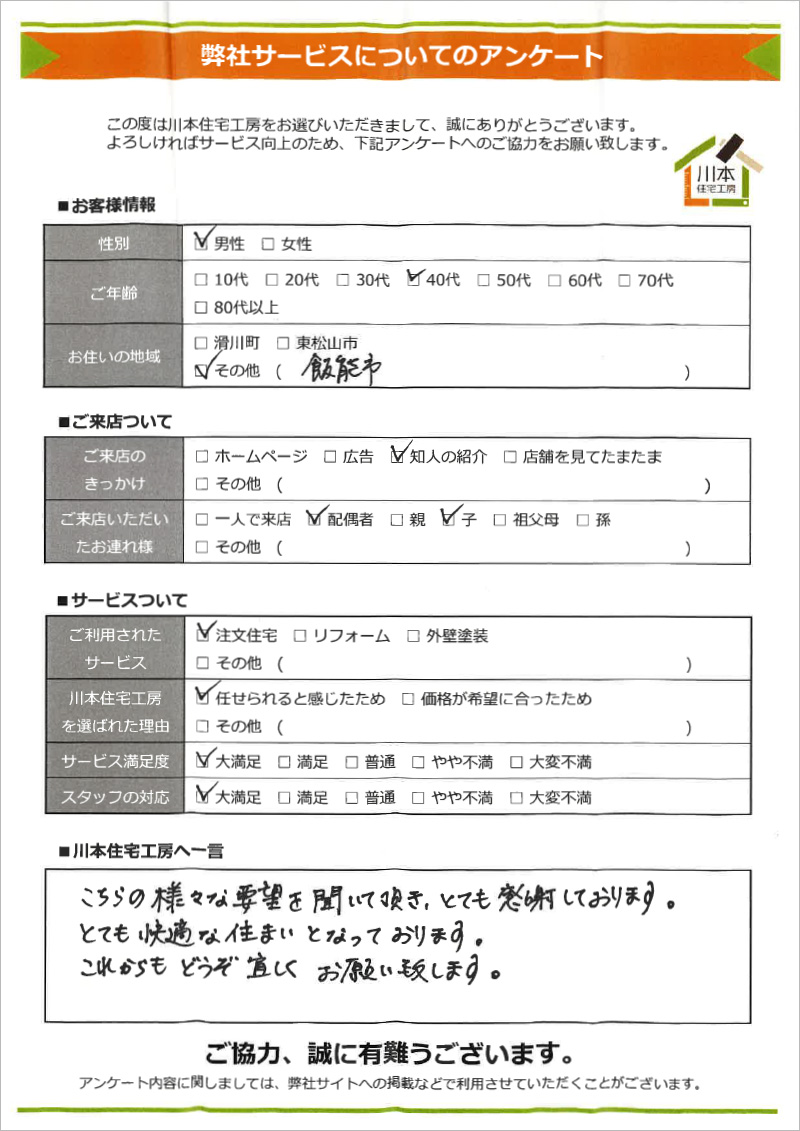 川本住宅工房が考える「いい家」とは、家族が健やかな毎日を送ることができる空間だと考えております。家族みんなが集まり、成長し安らぎのある空間。そんな空間をご提供したいと日々努力しております。私たちはお客様の声にじっくりと耳を傾け、一緒に家をつくりあげるという姿勢で仕事をしております。