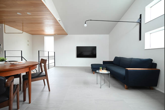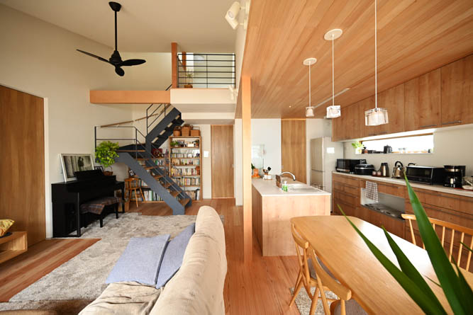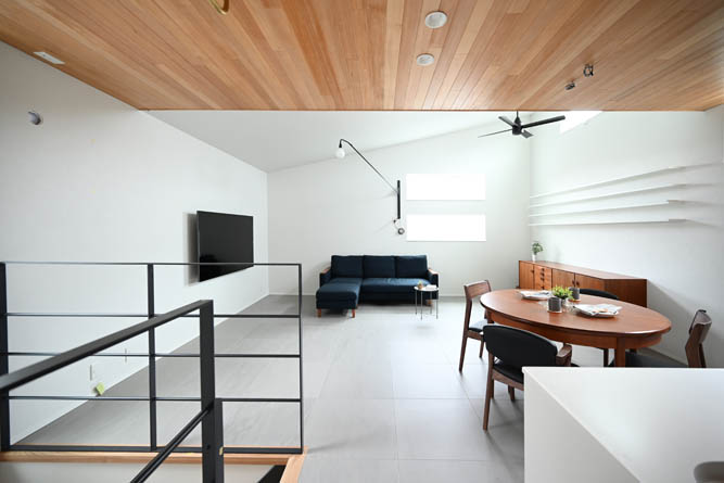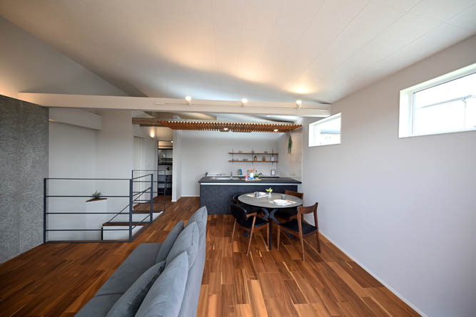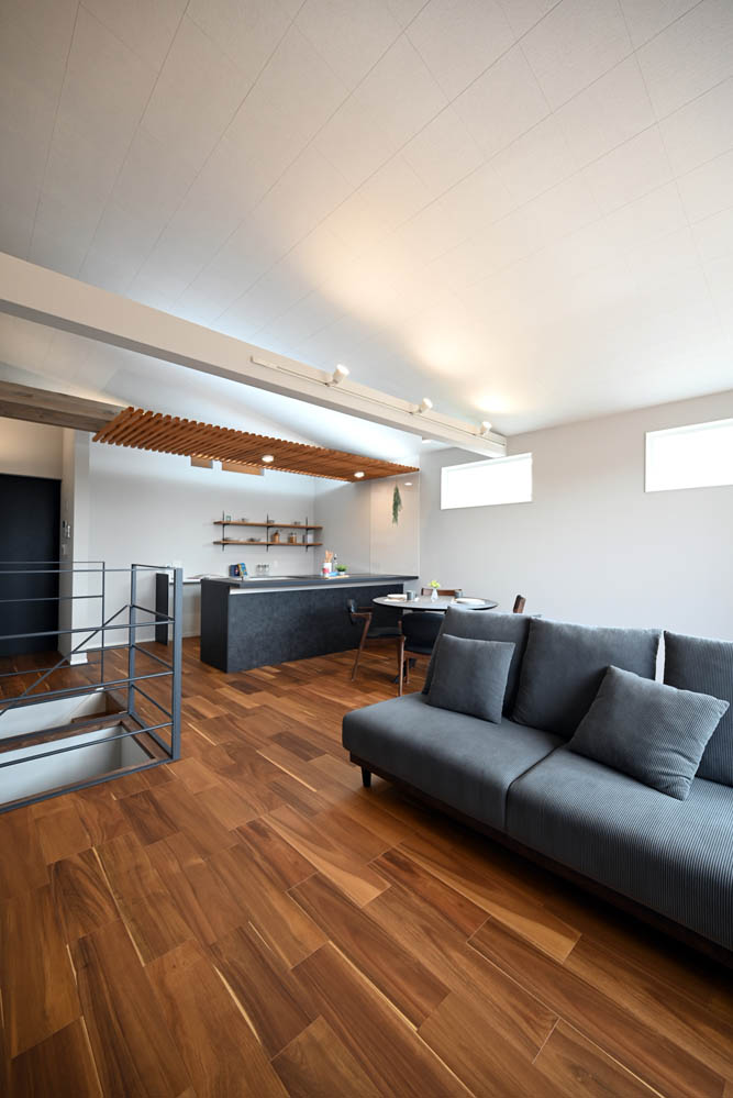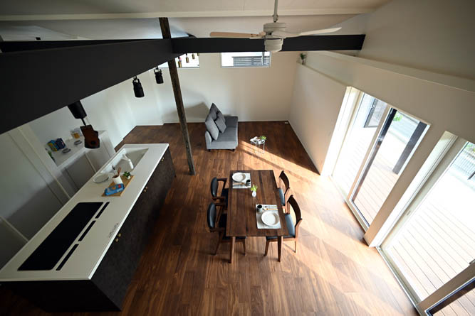 2階にあるLDK、片流れ屋根の勾配を活かし、天井を設けず高さを室内空間に。視界が抜け、広々とした開放感を味わえます。
