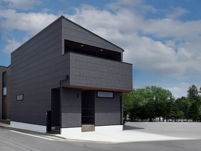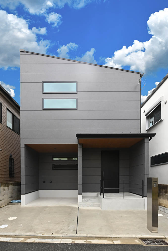 スタイリッシュなダークグレーの外壁が印象的なモダンな外観。都市の景観に溶け込みながらも存在感を放ちます
