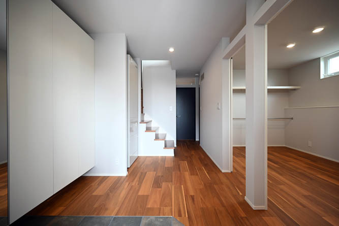 玄関により広がりを持たせられるように、シューズクロークも高さのないタイプを採用。より贅沢な空間となっている。雨風の日に自転車を入れたりしても手狭にならない広さ