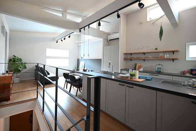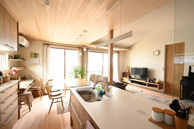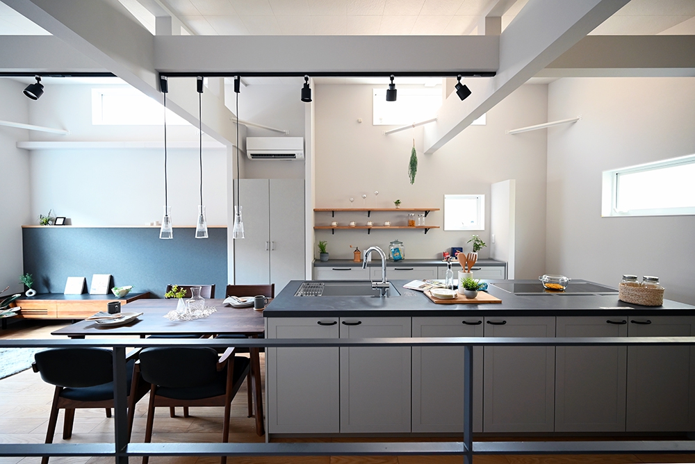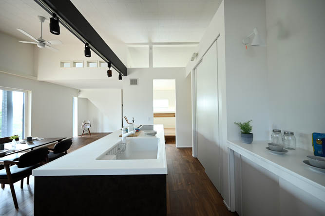 キッチンから家族の姿も好きなデザインを目にしながら家事ができるのも贅沢の一つですと奥様。採光もしっかり採ることができ、昼間は電気なしでも非常に明るくなっている