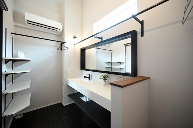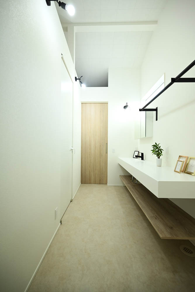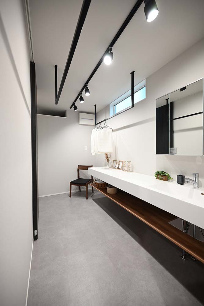 広々とした洗面スペースと、部屋干しにも対応するランドリー機能が一体となった空間。機能性とデザイン性を兼ね備えています。