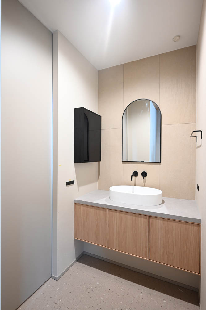 清潔感あふれる洗面所。湯気が出ないバスルームと合わせて、カビの心配を軽減します