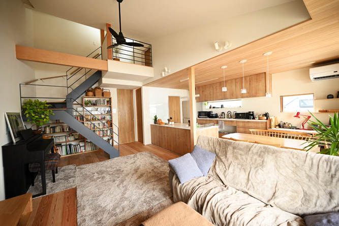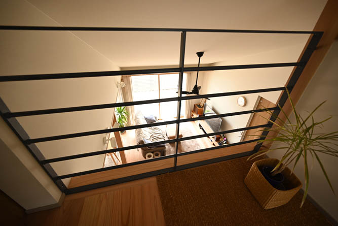 基本ワンフロアで生活が完結できるように設計。スケルトン階段をあがると和室があり、ご主人の趣味であったり、孫たちが訪問した際の客間として活躍