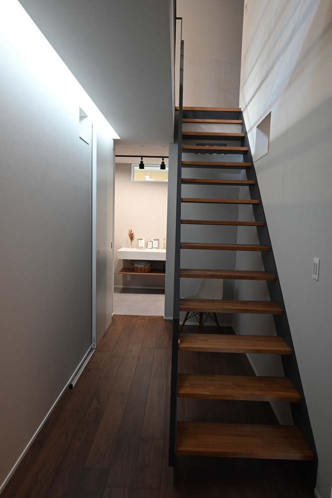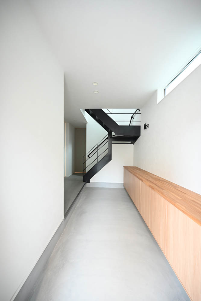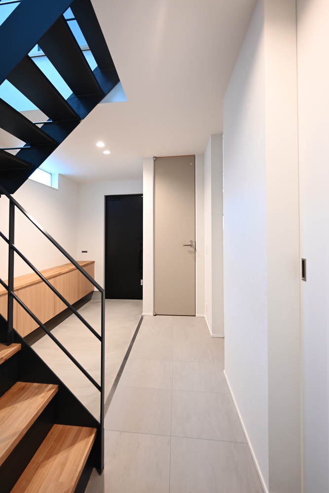 1階は白基調で統一。広めに設けた土間玄関が印象的。階段には鉄骨階段を採用し、アクセントを持たせたつくりに