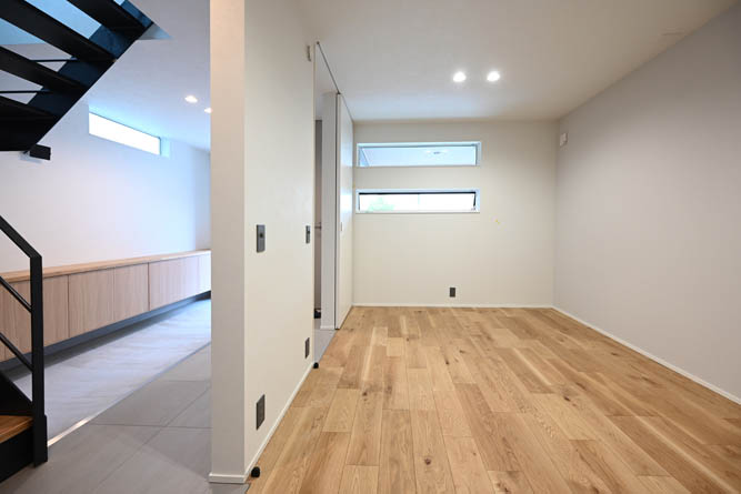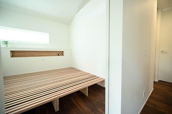 土間玄関からすぐにある部屋は子ども部屋。将来の2室に区切られるように施工してあります。当面は主寝室として使用、ベッドを置いても余裕があるくらいの広¥
