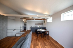 お住まいは2階LDKを採用。天井の勾配を活かすことで、非常に広い空間が広がっている。床は安全面を考慮しつつ特殊なフローリングを採用。一層モダンが空間に仕上がりました