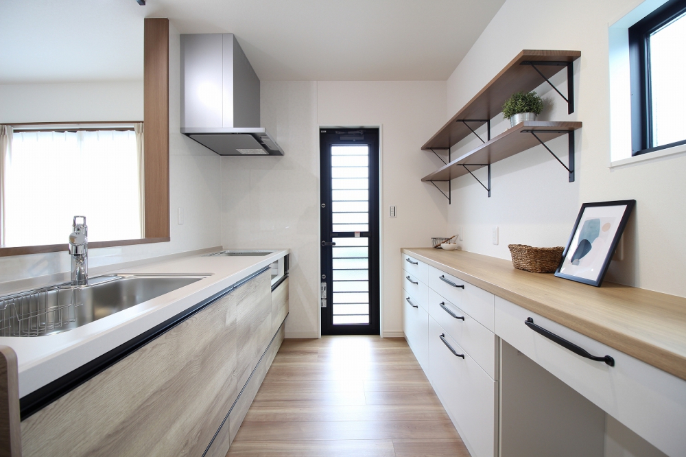 リビングに目が届くカウンターキッチンは、家族の気配を感じながら家事ができます。 勝手口からはゴミ出しやBBQの準備もスムーズで、毎日の暮らしを快適に。