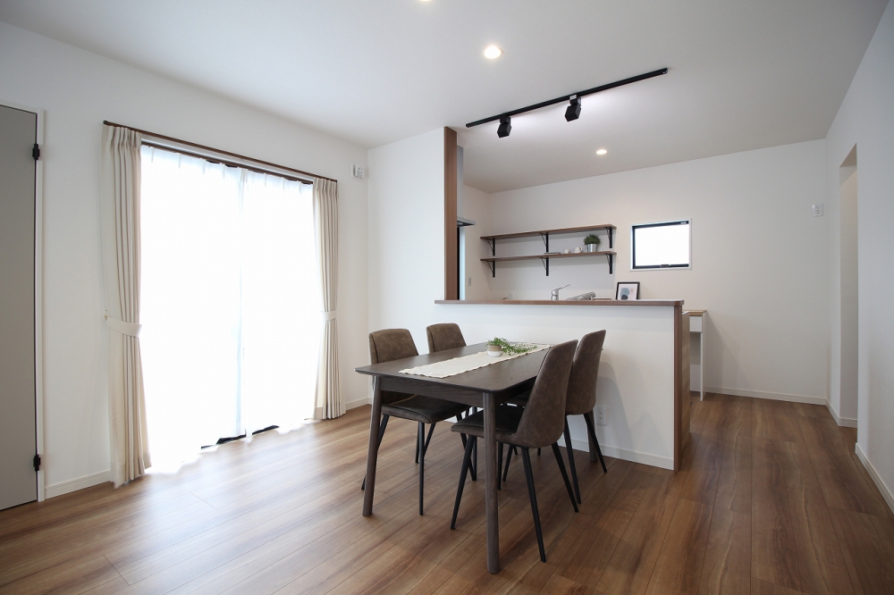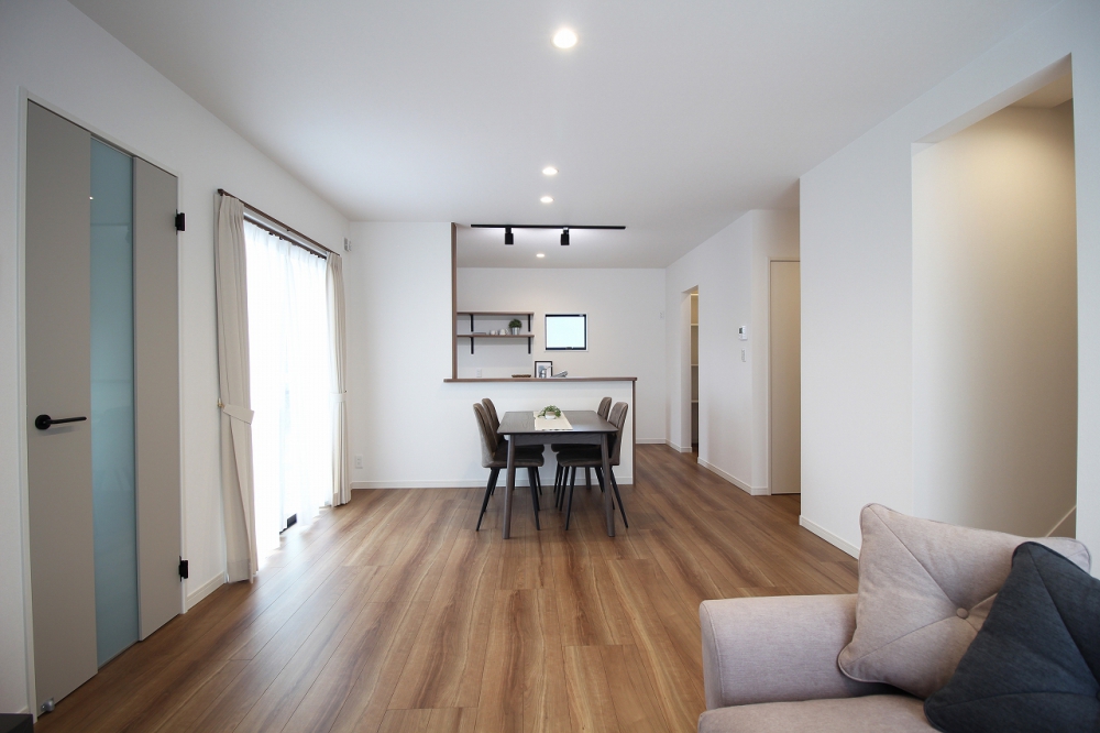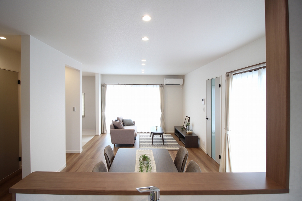 一直線につながるDKリビングで、家族のつながりを感じられるお家です。