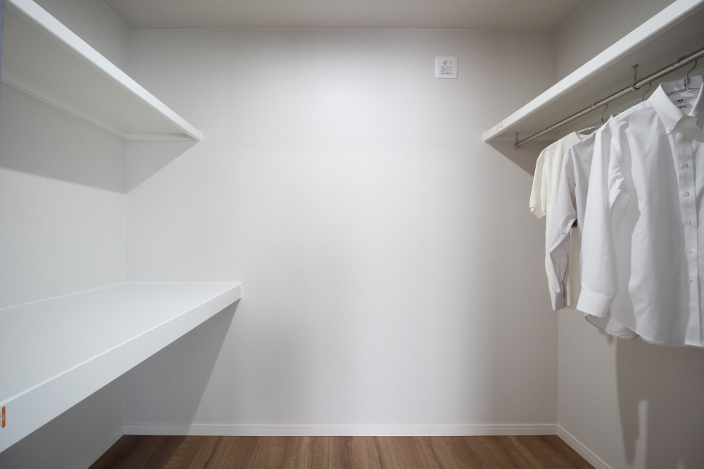 主寝室のウォークインクローゼットは、ハンガーパイプと可動棚を組み合わせています。
