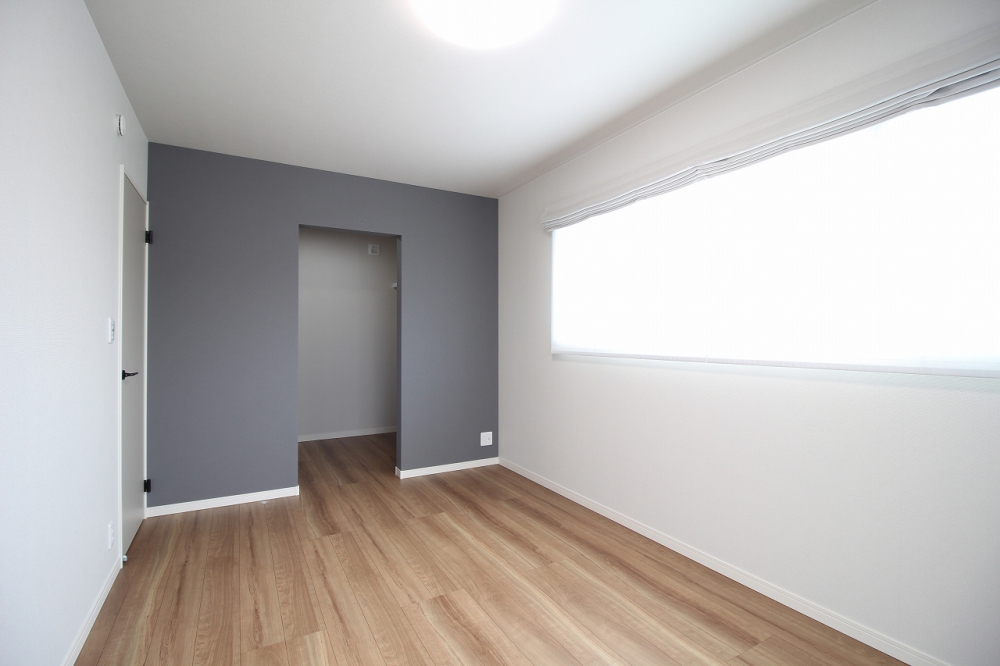 一面に落ち着いた色のクロスを採用し、心からくつろげる主寝室に。 クローゼットの入口はアーチ型にして、遊び心とデザイン性をプラスしました。