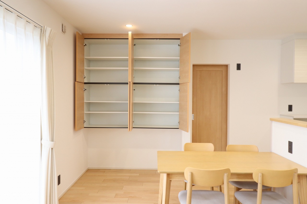 壁面収納:リビングの壁を利用した広い壁面収納は、かさばる生活用品の収納場所に。手軽に出し入れできるので、お子さまのお片づけの練習にも最適です。