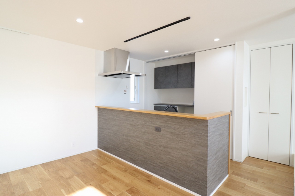 キッチンにはグレーを採用し、ミディアムトーンの床材と美しく調和しています。 スタイリッシュなシーリングライトが空間を引き締め、洗練された印象に仕上げました。