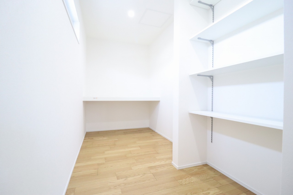 キッチン奥にはパントリーを設け、食材などをすぐに取り出しやすい便利な配置に。 2帖の広さがあり、可動棚付きなので、将来的にセカンド冷凍庫を置くスペースとしても活用できます。