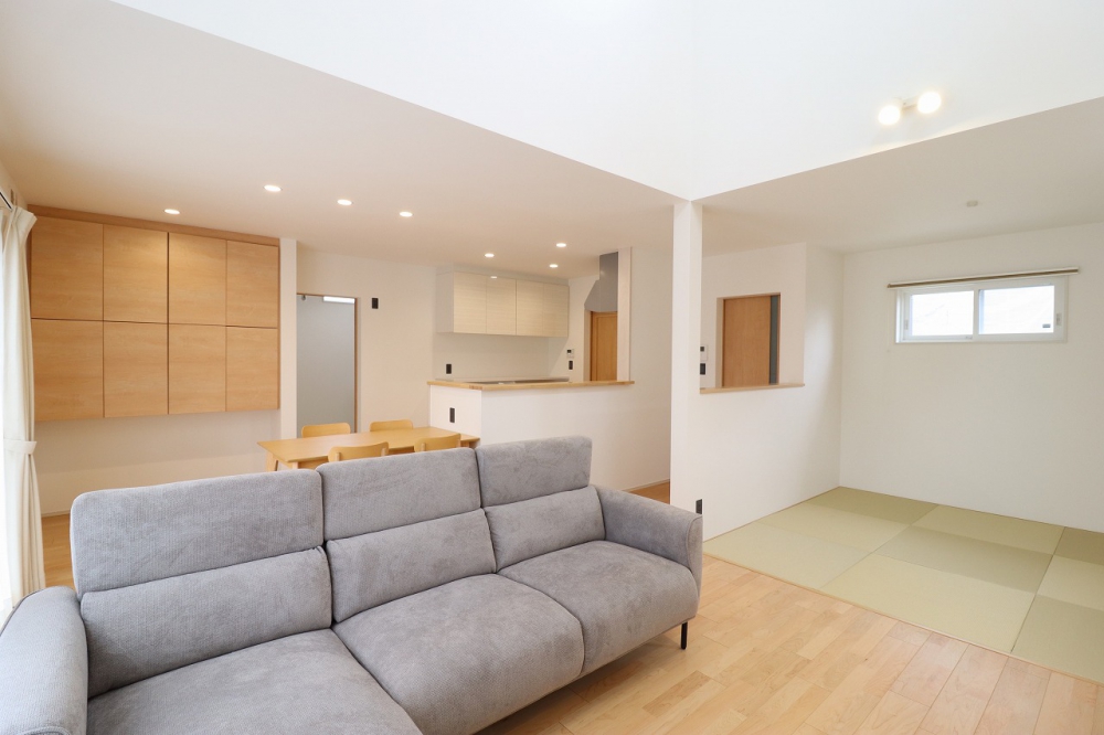 吹き抜けからやわらかな光が差し込む、明るく開放的な住まい。ナチュラルな素材感にジャパンディの落ち着きを取り入れ、心地よく過ごせる空間に仕上げました。壁面収納で空間はすっきり整い、畳コーナーはお子さまの遊び場やくつろぎの場として活躍します。