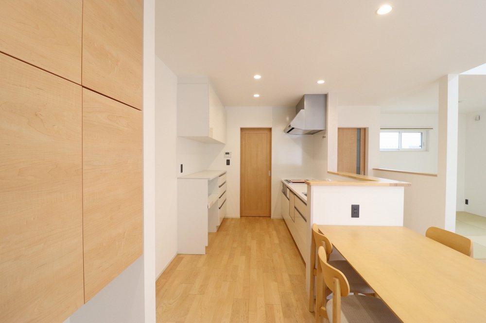 キッチンからも玄関からも水回りに行ける動線とし、生活のしやすさにもこだわりました。