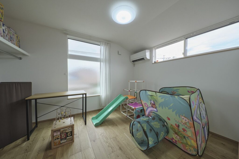 リビングを大きな吹き抜けの構造にしているため、1階からはわからないようにしましたが、階段を上がると2階はフローリングも幅木なども白が基調で、子供部屋も可愛らしいテイストにしました。
