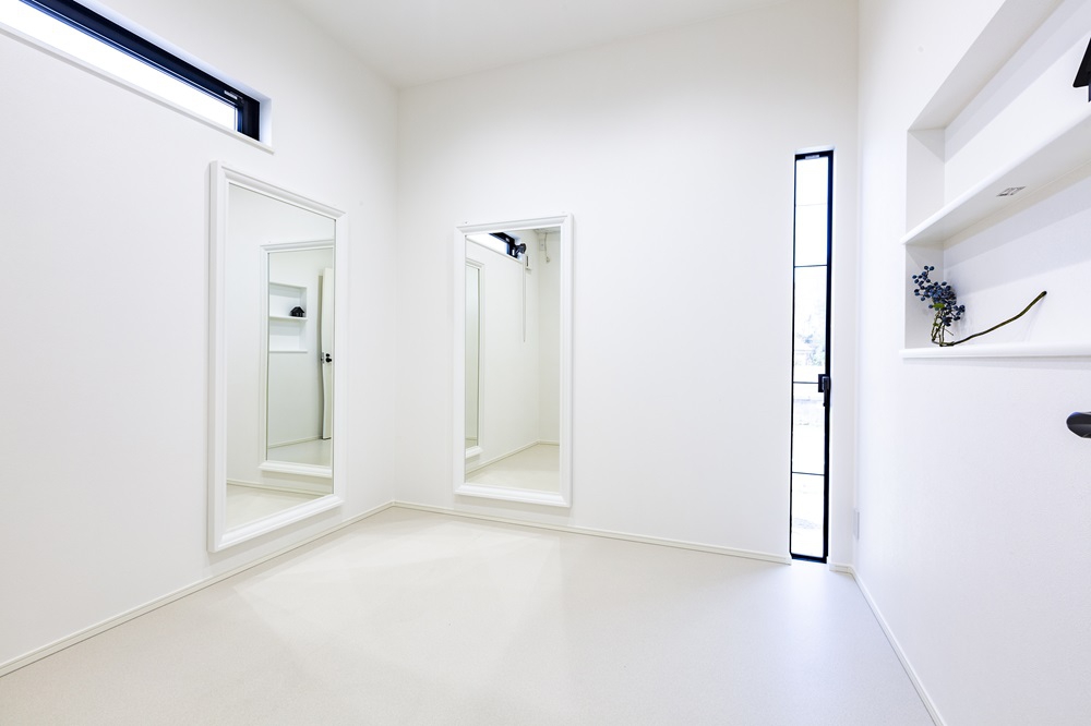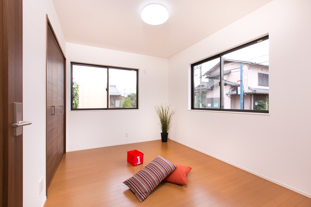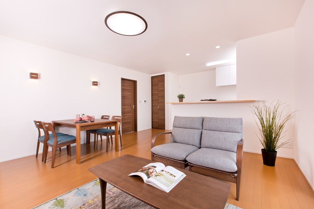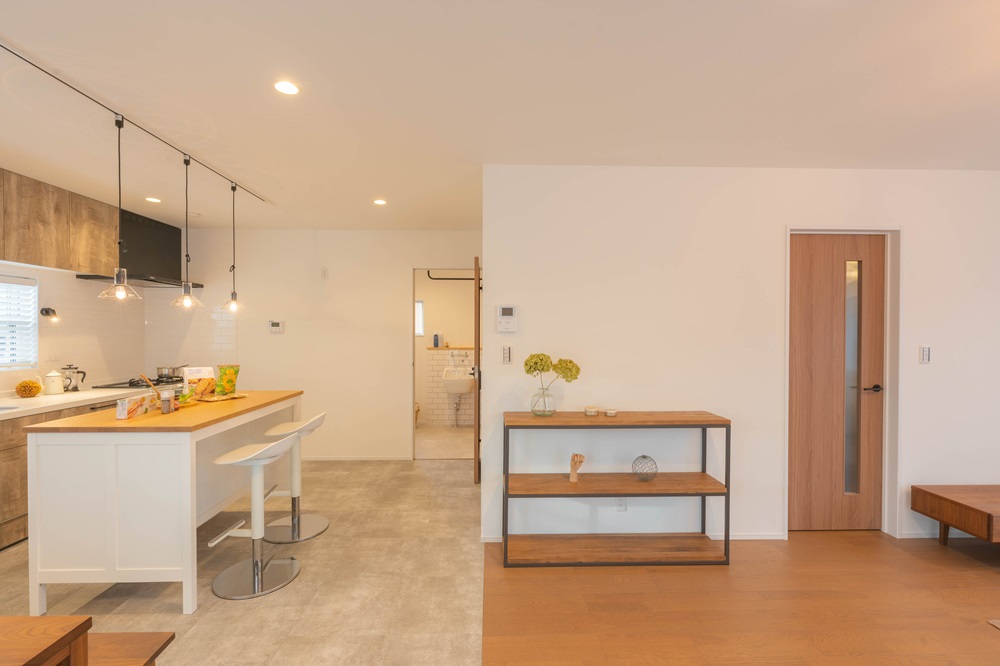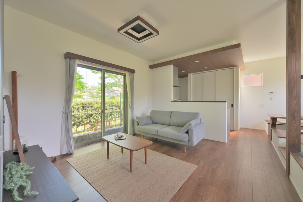 玄関→ファミリークローゼット→LDKという動線なので、LDKがいつもスッキリできる。お子様に自分でお片付けができるように声掛けがしやすいのも嬉しいポイント◎広々としたリビングには隠れ家的な雰囲気を感じさせる、和風ヌックがあり、ゆっくりと一人の時間も楽しめる。あたたかな木の優しさを、いつも感じられる居心地の良い住まいに。