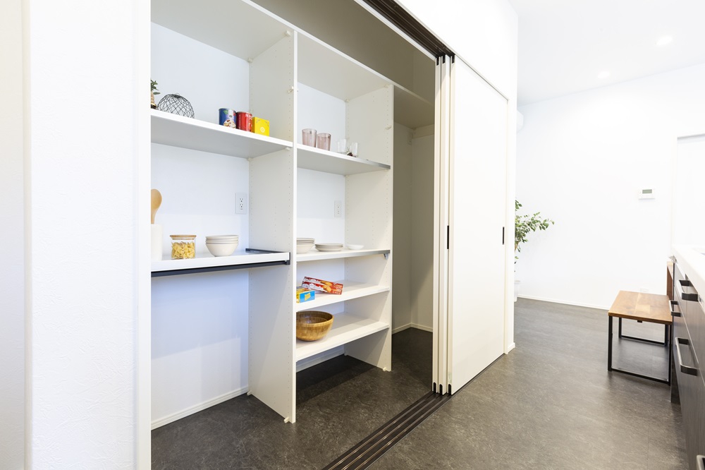 キッチンの横にパントリーをプランニング。造作の棚には扉をつけなかったので、必要なものがサッと取れて便利◎