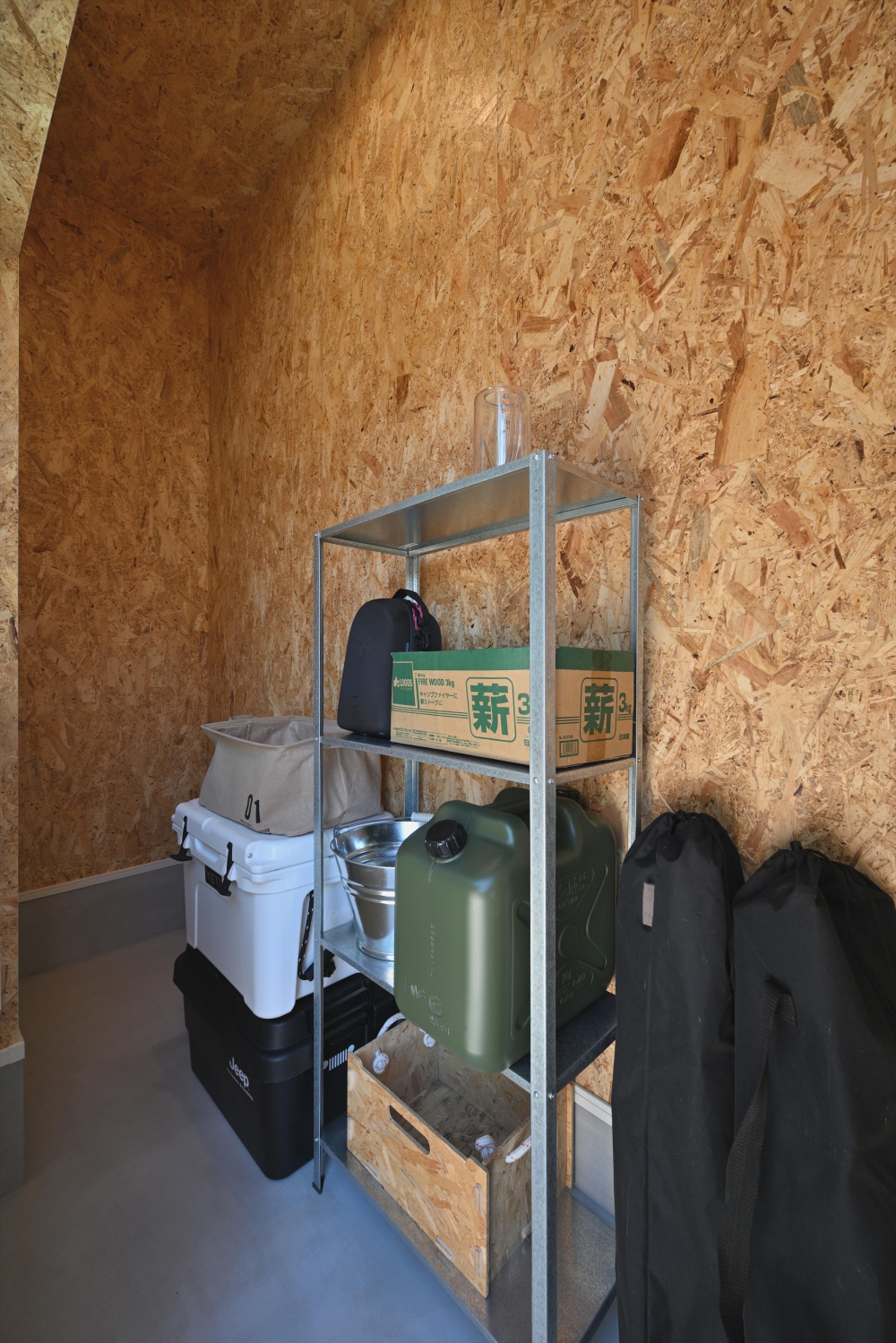 大切なキャンプ用品を収納できる外部収納。壁がOSB合板仕上げでビスも打てるので、自由に棚やフックを設置いただけます。