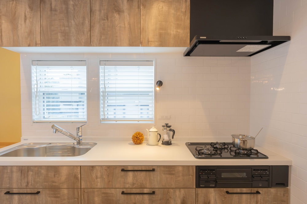 アンティーク風の木調が引き立つキッチン。壁面は白いタイル張りでおしゃれに演出