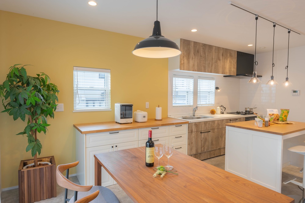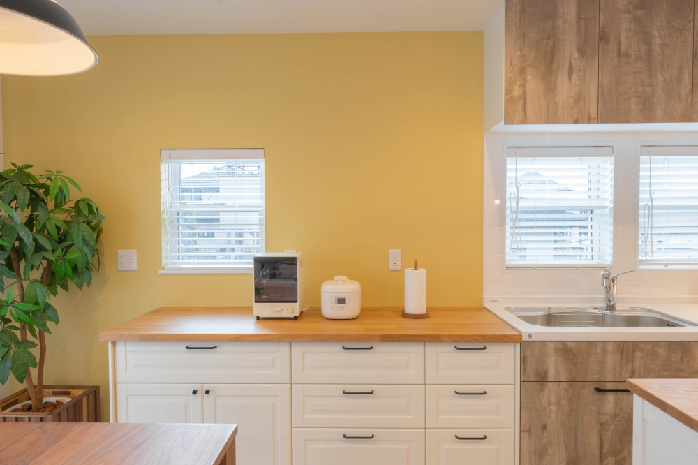 パウダーイエローが元気をくれるようなダイニングキッチン
