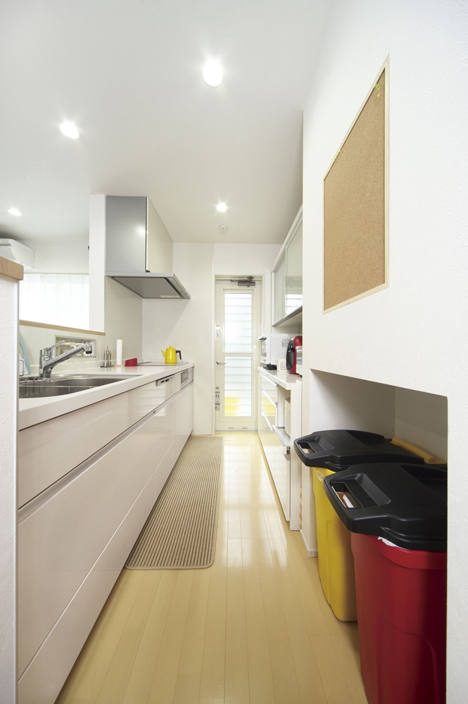 「以前の家は、旧家で台所が広かった。でも作業効率が悪くて使いにくくて。今はすべてスムーズに手が届き、快適ですね。娘と一緒にクッキーがつくれるくらいの広さは確保できていますし」。動線の良さと、適度な広さで快適なキッチンに。ごみ箱やコルクボードなど、ごちゃつきがちなものを壁面内に収めているから、いつも整然としている
