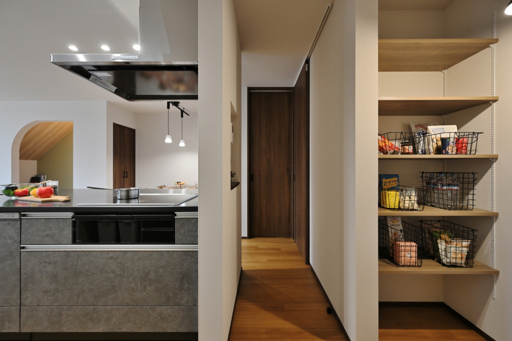玄関ホールから直接パントリーへ。買い物から帰ったら、パントリーで荷物を仕舞ってキッチンへと進む間取り