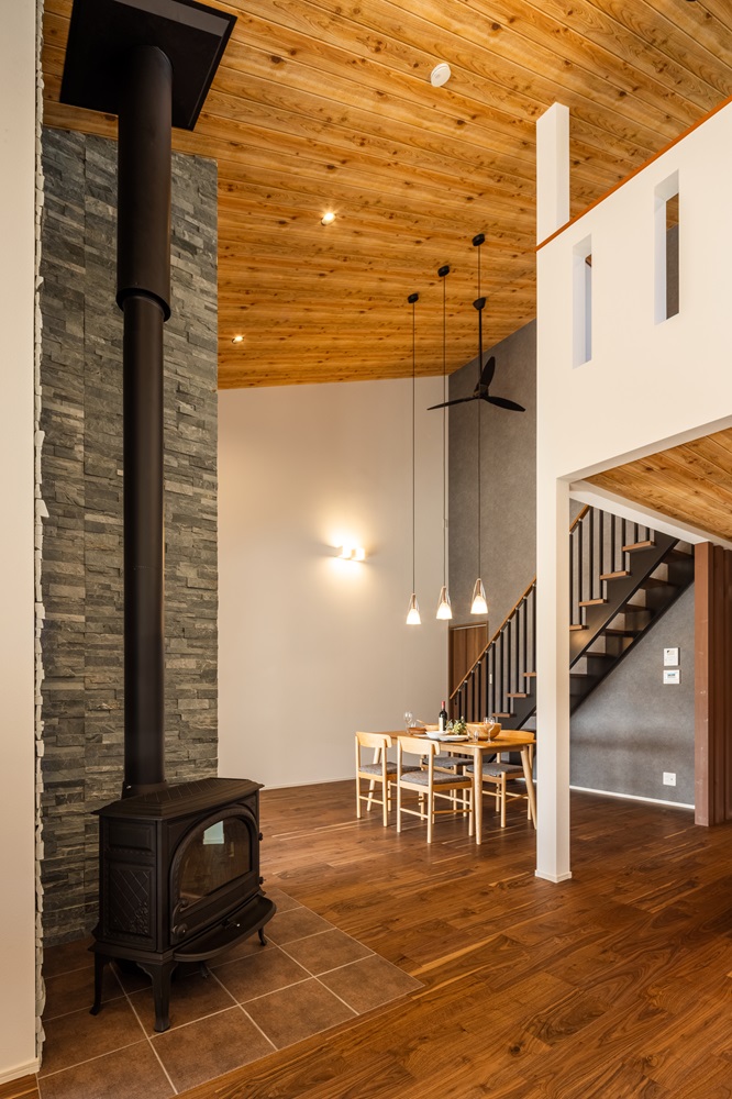 絶対に欲しいとのご希望だった暖炉は家のどこにいても目に入る位置に設置されました。