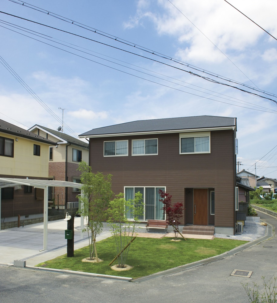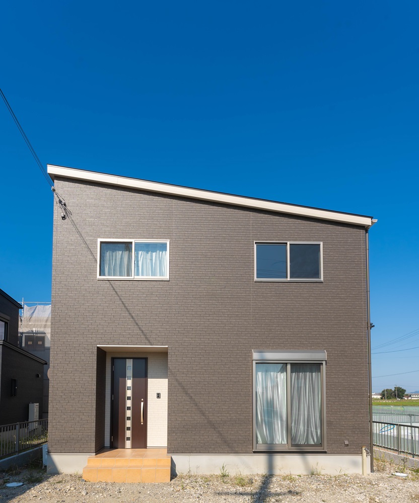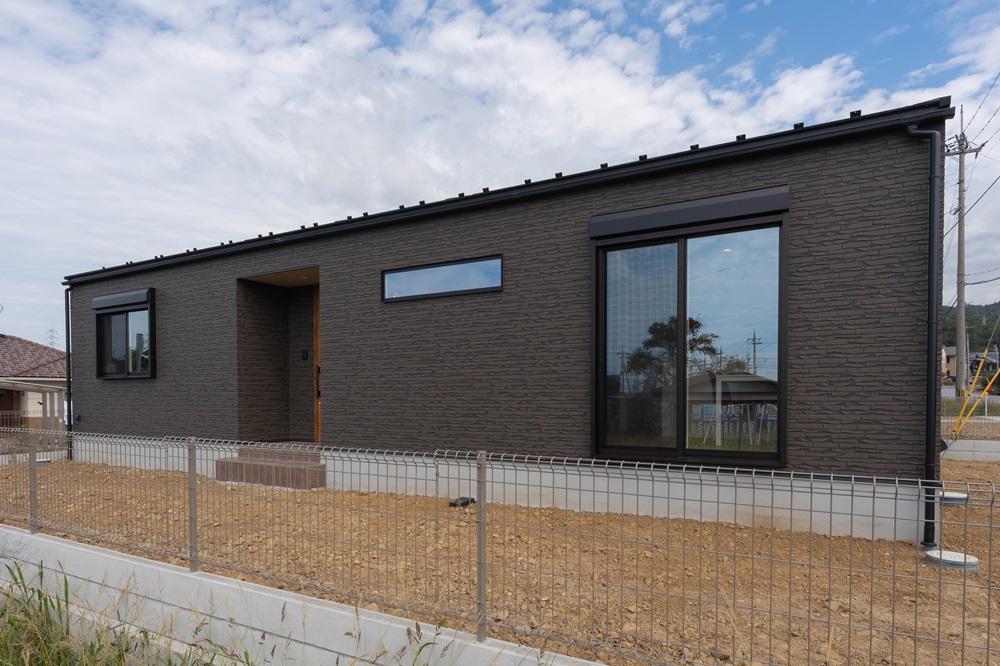 片流れ屋根のシンプルなフォルムにダークブラウンの外壁で落ち着きあるデザイン