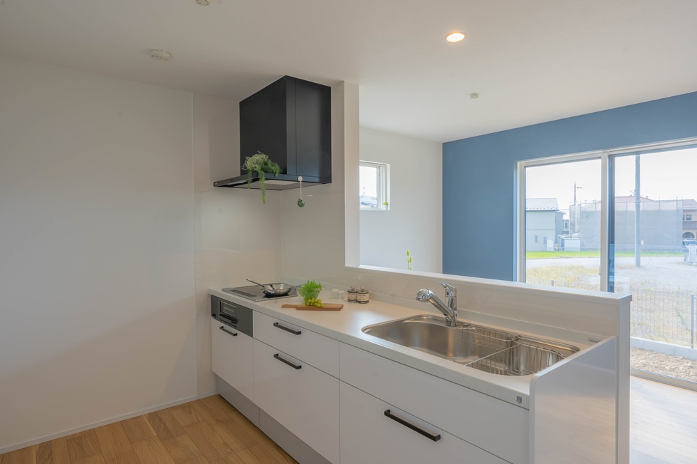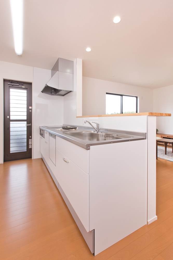 白が基調の清潔感あふれるキッチンは、オープンタイプで視界良好