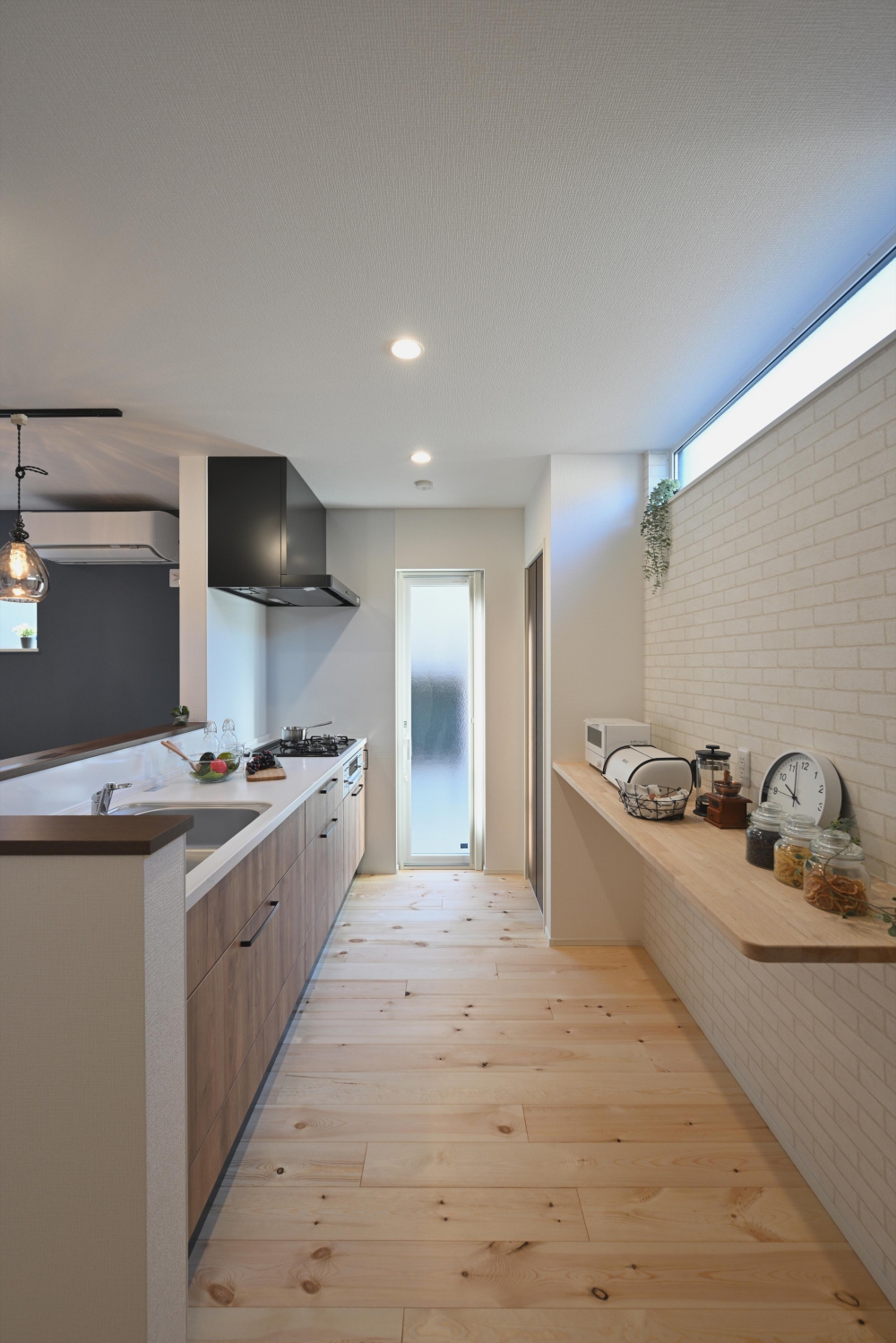 キッチンには無垢のカウンターを設置。奥にはパントリーも設置。