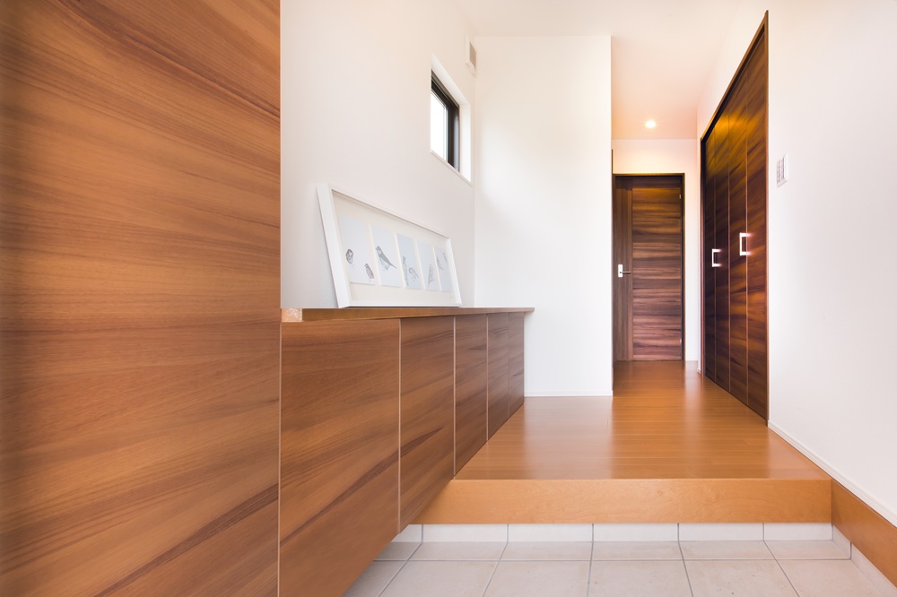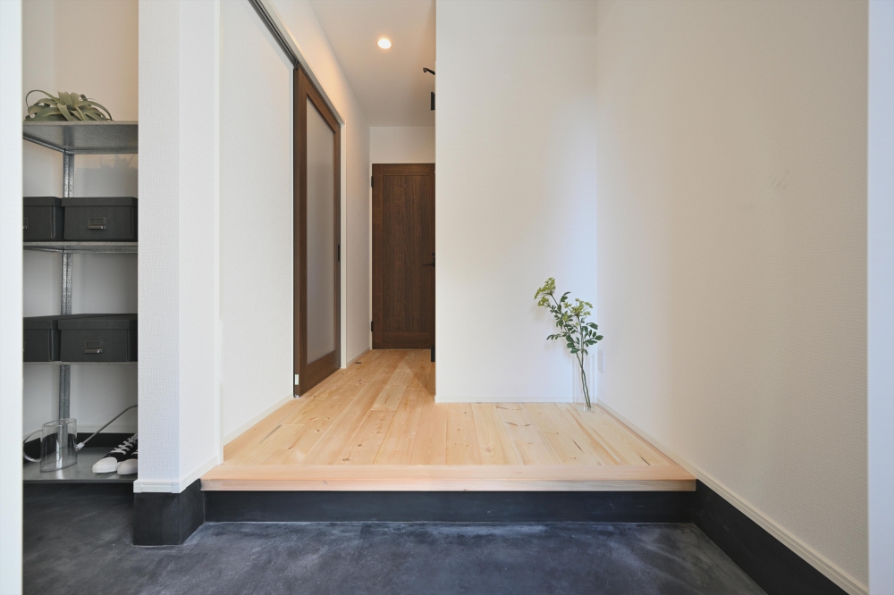 玄関のニッチは構造材の端材を利用。入って正面には、将来お母様との同居も考えて、どうしてもほしかったという和室を設計