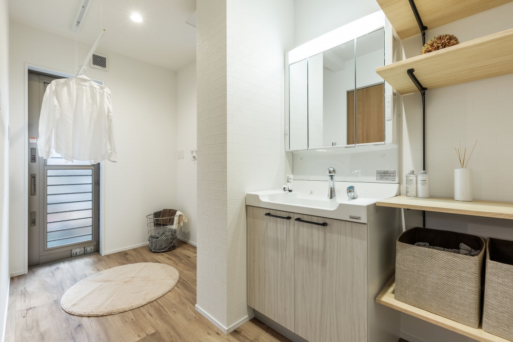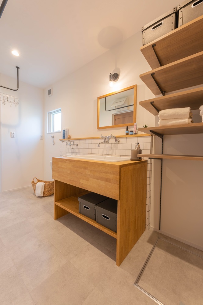 脱衣室兼ランドリールーム。カウンターを造作し、洗濯物を畳んだり、アイロンをかけたり。「打合せの時に3Dパースを作ってもらえたから、どんな空間になるのかイメージしやすかったです」