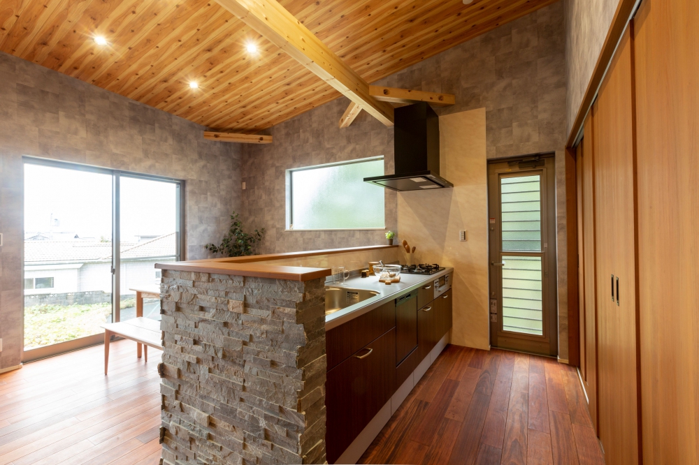 キッチンは天然石張り。「いろんな素材を見て選びました。サンプルをお願いしたら、たくさん持ってきてくれて。常に選択肢をアドバイスしてくれる姿勢はありがたかったですね」