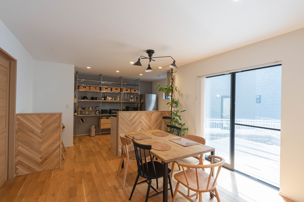 ダイニングの前は大きな掃き出し窓に。自然光たっぷり