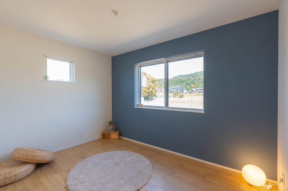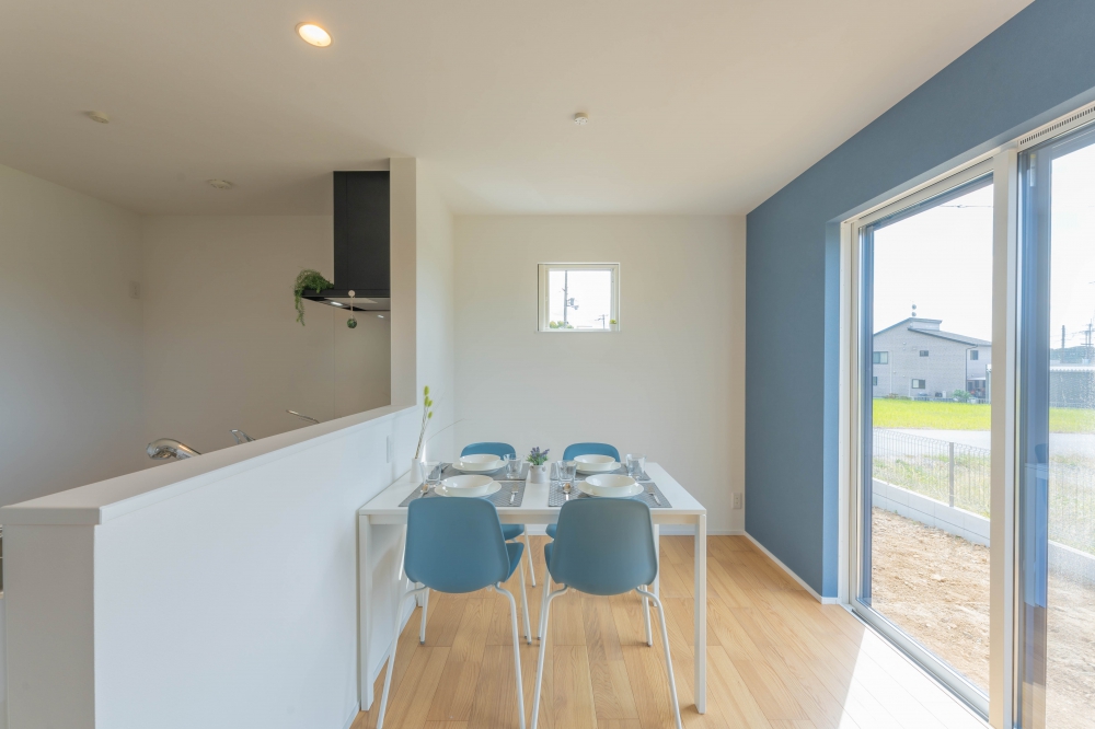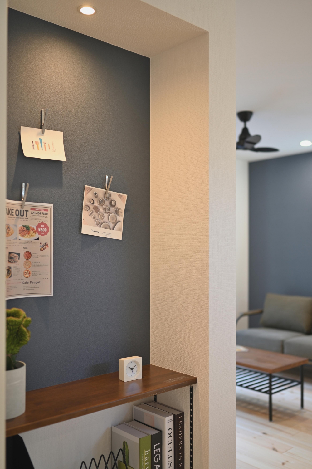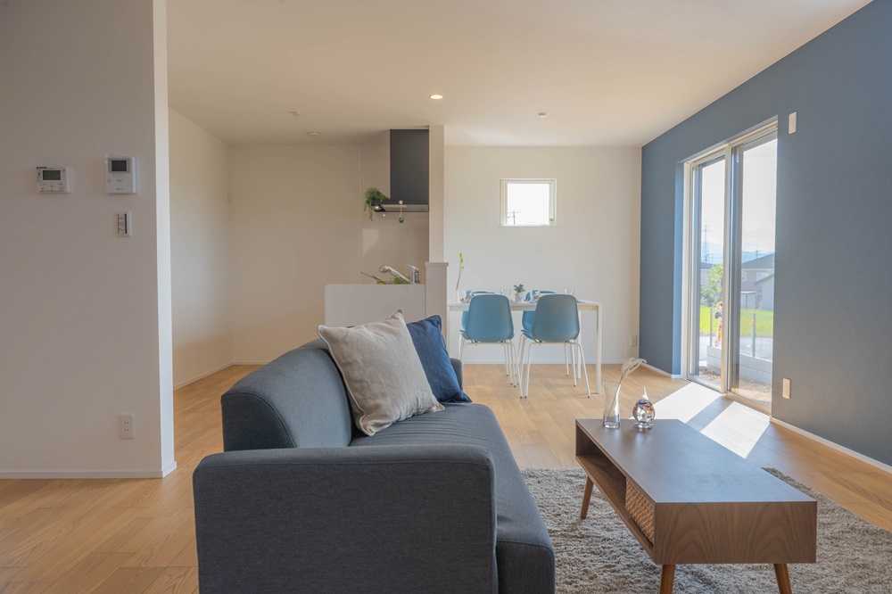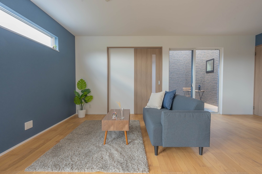 リビングの壁面は、ブルーのアクセントクロスをチョイス