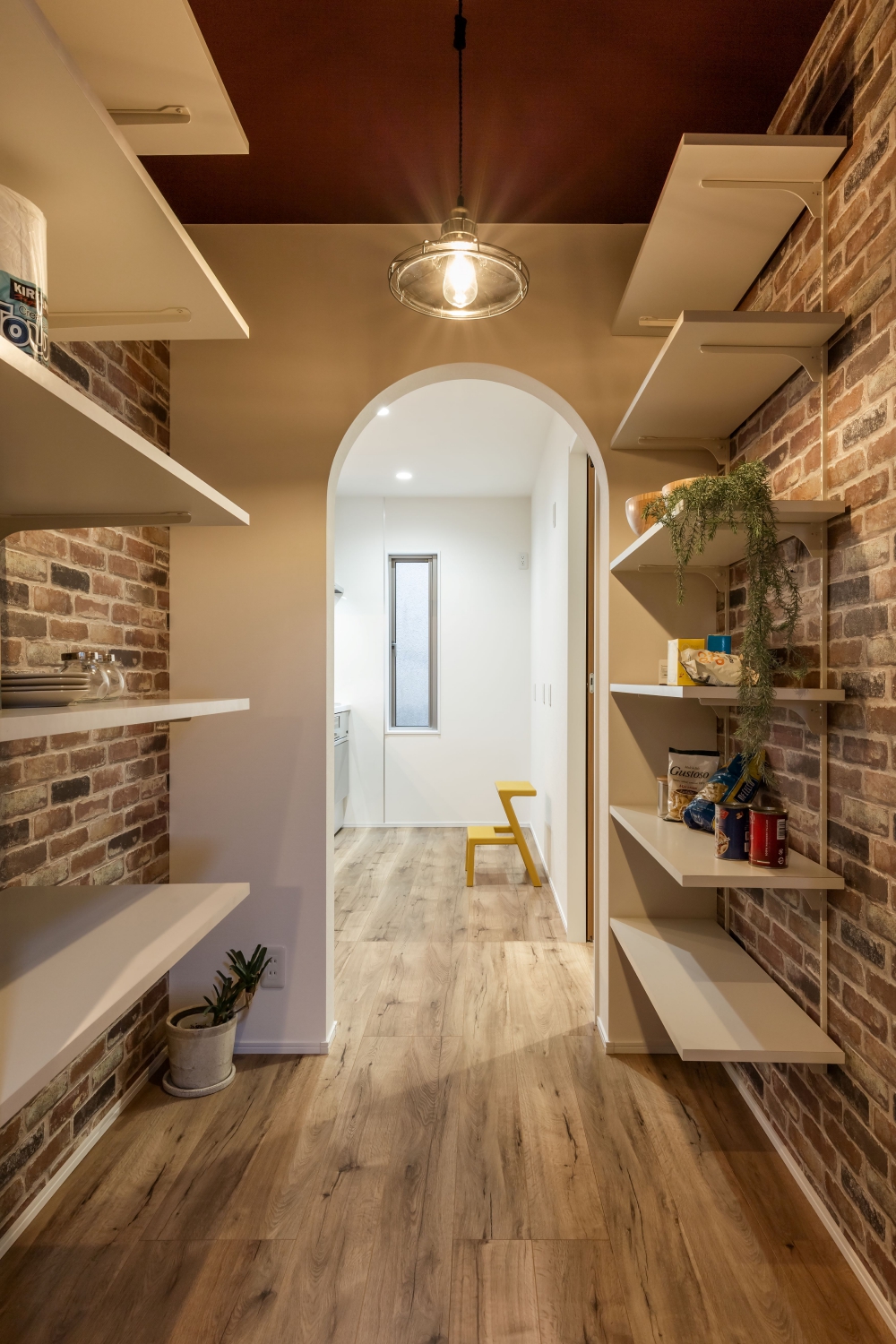 パントリーの内部はレンガ調のクロス。入り口をアールにして可愛らしく仕上げた