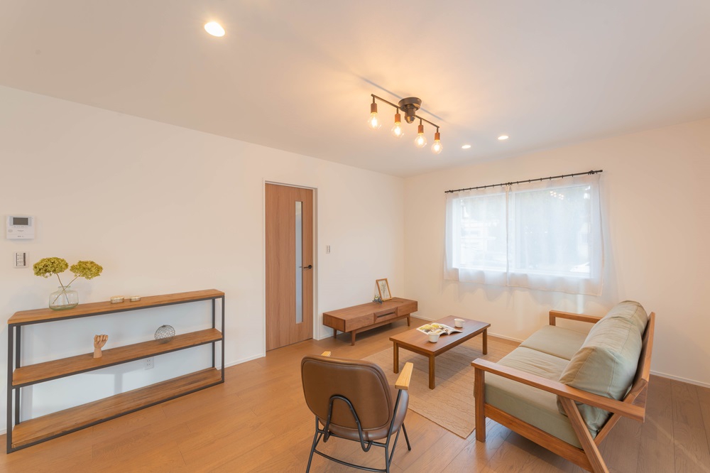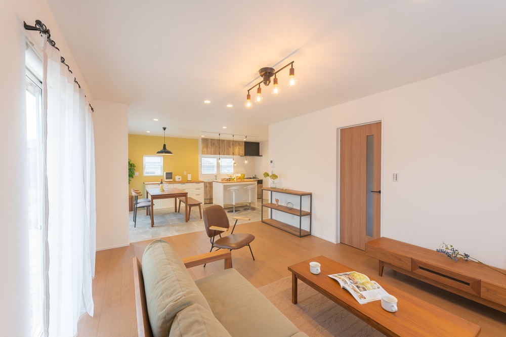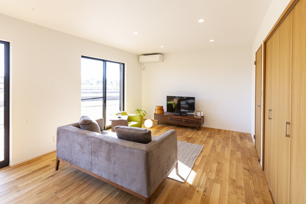 広々としたリビング。無垢床を取り入れ、ナチュラルで優しい空間になっている。窓から明るい光が入り、より温かみのある空間に。
