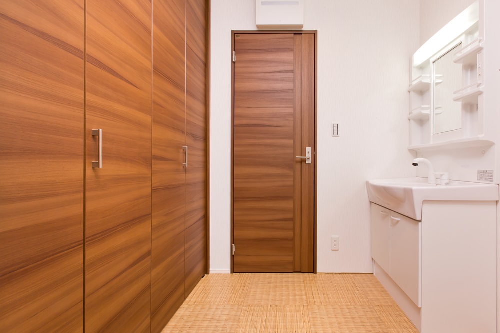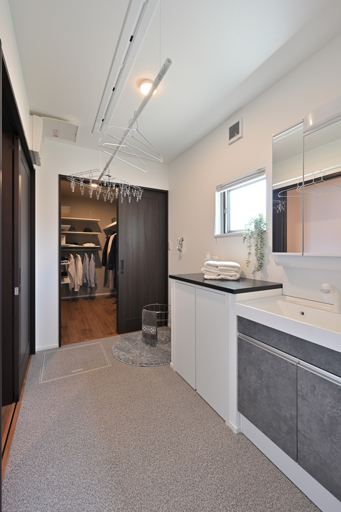 花粉症のNさんは、洗濯物は室内干し派。物干しを設置した広い脱衣室の隣はウォークインクローゼット。乾いた衣類をすぐに収納できる