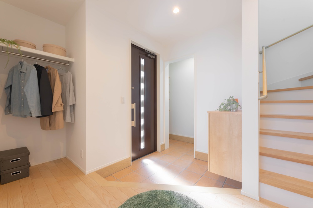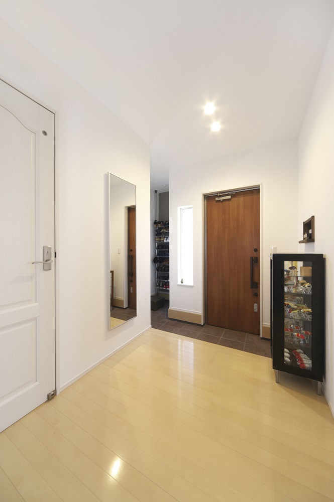 たっぷりの土間スペースや、ホールに設けた上着掛けなどスムーズな生活動線と適所の収納で、毎日の家事をサポート。「カステルホームさんは建てる側の身になって、予算面にも目配りしてくれる。シンプルにまとめながら、的確にカタチにしてくれました」。同社との出会いによって夢を叶えたKさんだ。