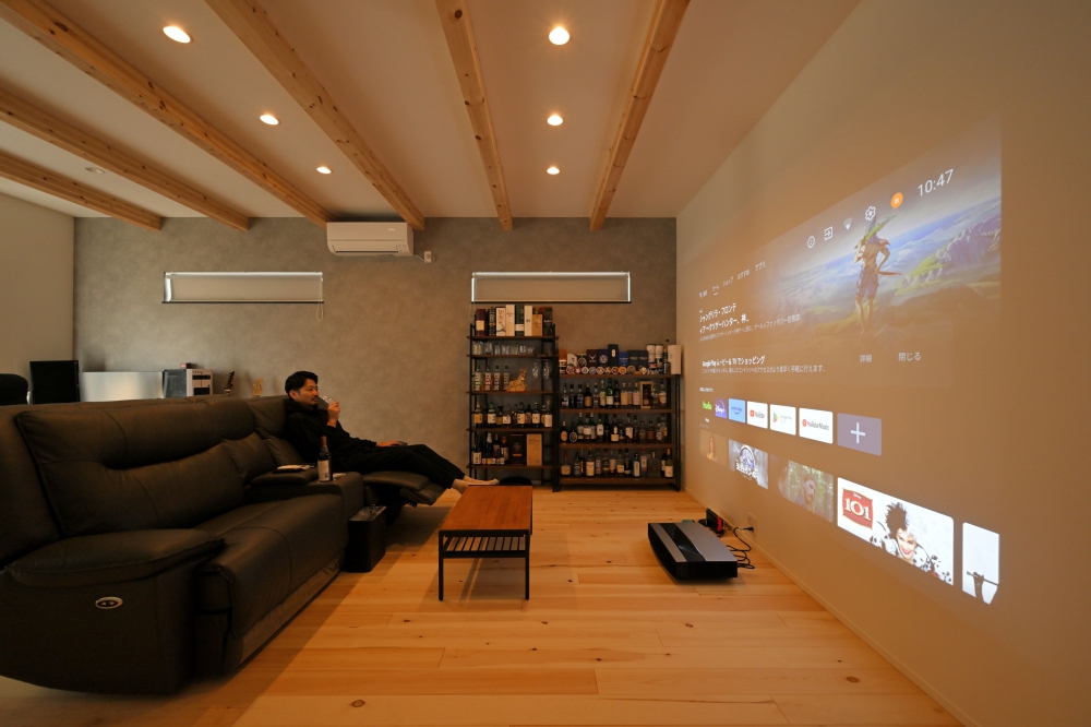TVは置かず、プロジェクターで楽しむ。頭上は無垢パインの化粧梁で空間にアクセントを添えている