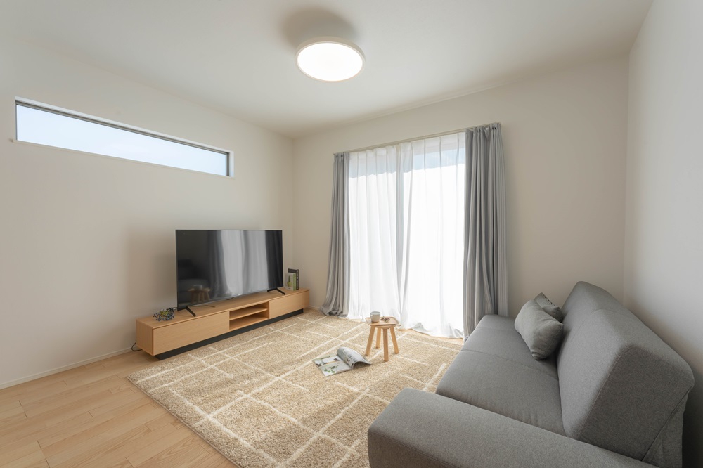 ハイサイドライトを設け、隣家の視線をかわしながら光を取り込む。やわらかな光に包まれるリビング