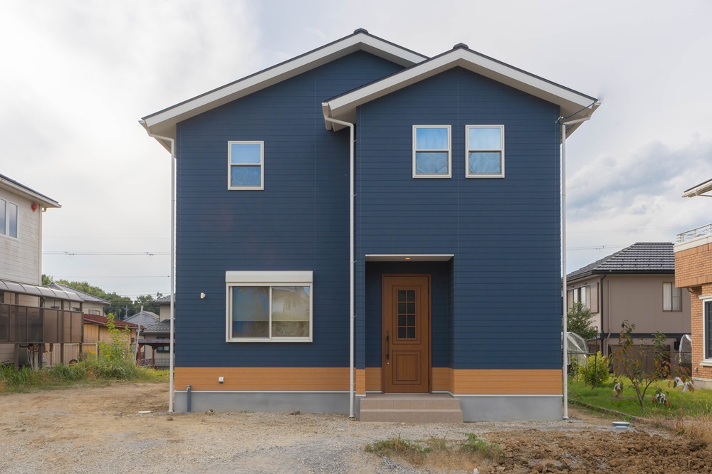ネイビーとイエローの外壁が三角屋根にマッチ。輸入住宅のような外観デザイン